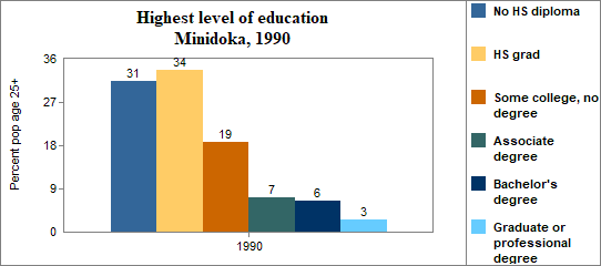 In Minidoka . . . - 26 percent of the population 25 years and older in 2000 had no high school diploma, compared to 15 percent in Idaho