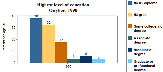 In Owyhee . . . - 32 percent of the population 25 years and older in 2000 had no high school diploma, compared to 15 percent in Idaho