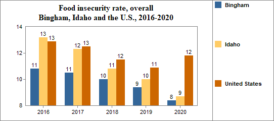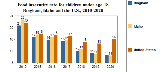 Between 2010 and 2020, the food insecure population in Bingham decreased by 40 percent and the number of food insecure children decreased by 20 percent.