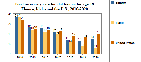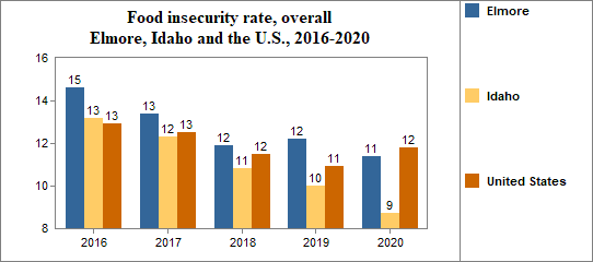 Between 2010 and 2020, the food insecure population in Elmore decreased by 26 percent and the number of food insecure children decreased by 24 percent.