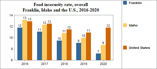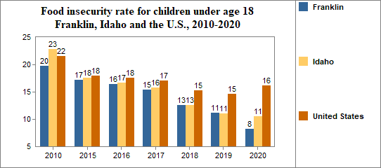 Between 2010 and 2020, the food insecure population in Franklin decreased by 43 percent and the number of food insecure children decreased by 13 percent.