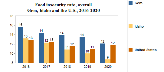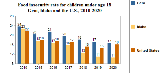 Between 2010 and 2020, the food insecure population in Gem decreased by 29 percent and the number of food insecure children decreased by 21 percent.