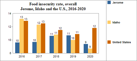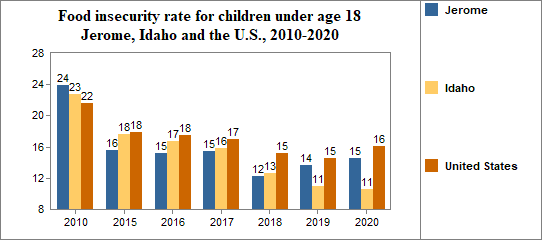 Between 2010 and 2020, the food insecure population in Jerome decreased by 30 percent and the number of food insecure children decreased by 29 percent.