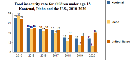 Between 2010 and 2020, the food insecure population in Kootenai decreased by 29 percent and the number of food insecure children decreased by 14 percent.