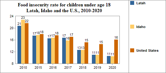 Between 2010 and 2020, the food insecure population in Latah decreased by 35 percent and the number of food insecure children decreased by 10 percent.