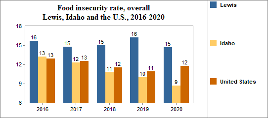 Between 2010 and 2020, the food insecure population in Lewis stayed the same 0 percent and the number of food insecure children decreased by 11 percent.