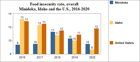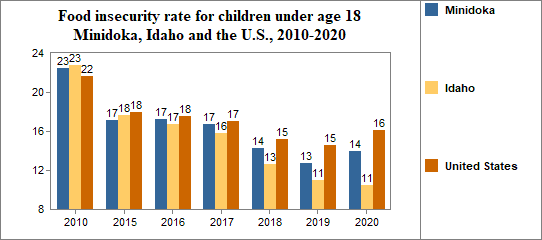Between 2010 and 2020, the food insecure population in Minidoka decreased by 27 percent and the number of food insecure children decreased by 23 percent.
