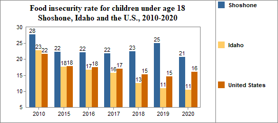 Between 2010 and 2020, the food insecure population in Shoshone decreased by 28 percent and the number of food insecure children decreased by 21 percent.
