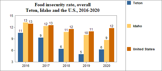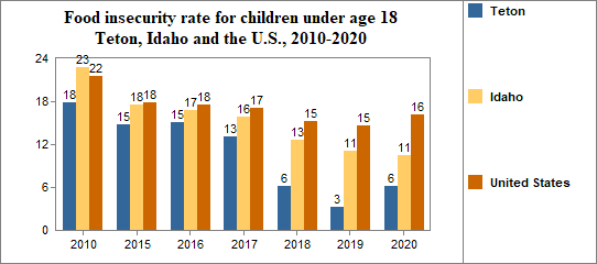 Between 2010 and 2020, the food insecure population in Teton decreased by 41 percent and the number of food insecure children decreased by 2 percent.