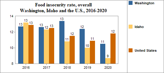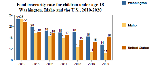 Between 2010 and 2020, the food insecure population in Washington decreased by 37 percent and the number of food insecure children decreased by 16 percent.