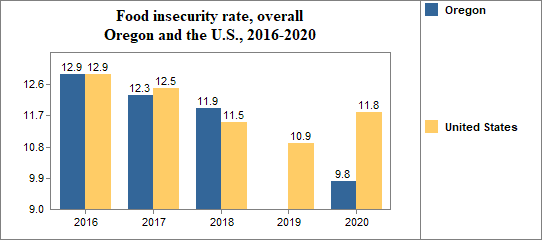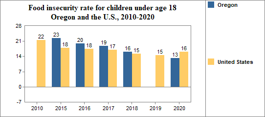 Between 2010 and 2020, the food insecure population in Oregon increased by NA percent and the number of food insecure children increased by NA percent.