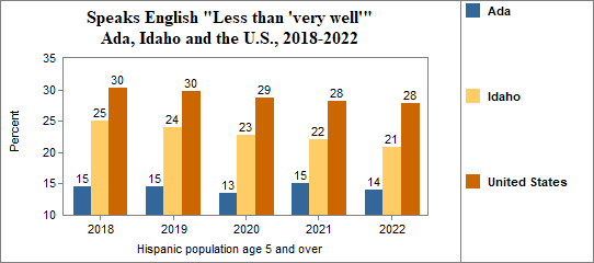 - the foreign-born Hispanic population numbered 8,254, and 8 percent spoke only English, 37 percent spoke English "Very well" while 56 percent spoke English "Less than 'very well.'"