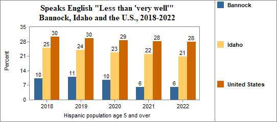 - the foreign-born Hispanic population numbered 794, and 26 percent spoke only English, 41 percent spoke English "Very well" while 33 percent spoke English "Less than 'very well.'"
