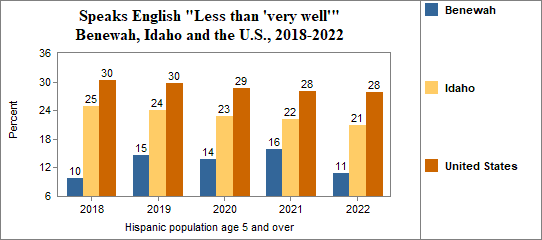 - the foreign-born Hispanic population numbered 42, and 0 percent spoke only English, 21 percent spoke English "Very well" while 79 percent spoke English "Less than 'very well.'"