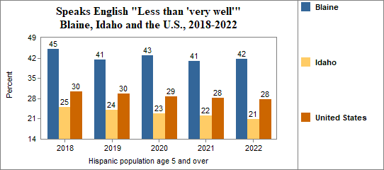 - the foreign-born Hispanic population numbered 3,140, and 5 percent spoke only English, 25 percent spoke English "Very well" while 70 percent spoke English "Less than 'very well.'"