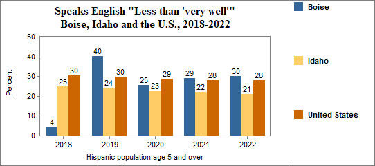 - the foreign-born Hispanic population numbered 131, and 18 percent spoke only English, 15 percent spoke English "Very well" while 68 percent spoke English "Less than 'very well.'"