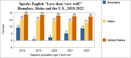 - the foreign-born Hispanic population numbered 156, and 55 percent spoke only English, 0 percent spoke English "Very well" while 45 percent spoke English "Less than 'very well.'"