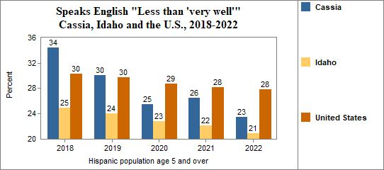 - the foreign-born Hispanic population numbered 2,056, and 7 percent spoke only English, 40 percent spoke English "Very well" while 54 percent spoke English "Less than 'very well.'"