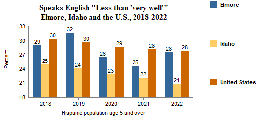 - the foreign-born Hispanic population numbered 1,312, and 8 percent spoke only English, 20 percent spoke English "Very well" while 72 percent spoke English "Less than 'very well.'"