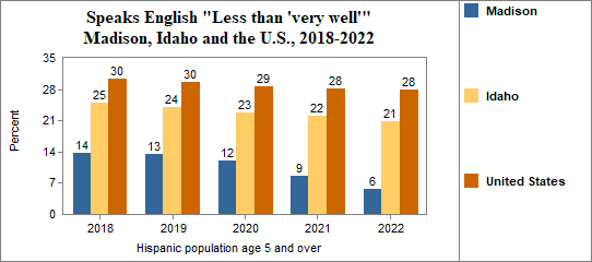 - the native-born Hispanic population numbered 3,003, and 60 percent spoke only English, 40 percent spoke English "Very well" while 0 percent spoke English "Less than 'very well,'"