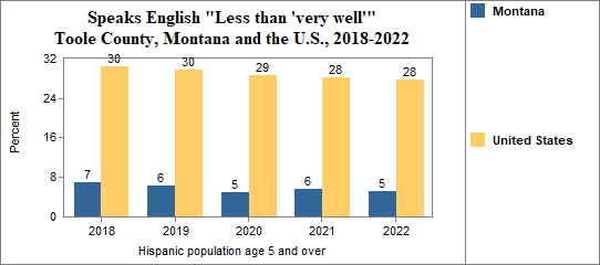 - the foreign-born Hispanic population numbered NA, and NA percent spoke only English, NA percent spoke English "Very well" while NA percent spoke English "Less than 'very well.'"