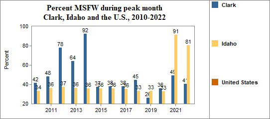 In this indicator we report on the average number of agricultural workers throughout the year and the number and month of peak employment for migrant and seasonal farmworkers (MSFW). The number of MSFW changes month to month as workers move for seasonal employment.