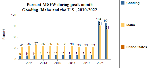 In this indicator we report on the average number of agricultural workers throughout the year and the number and month of peak employment for migrant and seasonal farmworkers (MSFW). The number of MSFW changes month to month as workers move for seasonal employment.