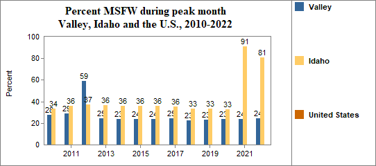 In this indicator we report on the average number of agricultural workers throughout the year and the number and month of peak employment for migrant and seasonal farmworkers (MSFW). The number of MSFW changes month to month as workers move for seasonal employment.