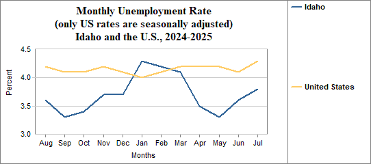 Idaho's monthly unemployment rate was 3.8 percent in July, 2025. This compares to 4.3 percent in the U.S. as a whole.
