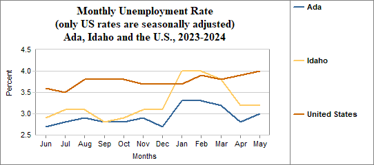 Ada's monthly unemployment rate was 3.0 percent in May, 2024. This compares to 3.2 percent in Idaho as a whole.