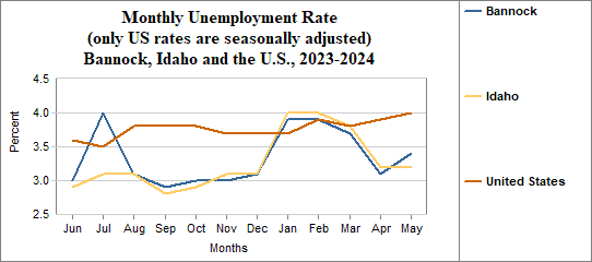 Bannock's monthly unemployment rate was 3.4 percent in May, 2024. This compares to 3.2 percent in Idaho as a whole.