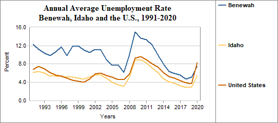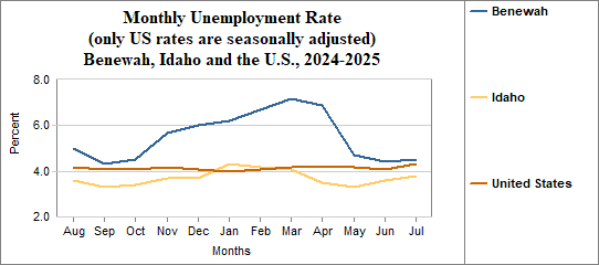 Benewah's monthly unemployment rate was 4.5 percent in July, 2025. This compares to 3.8 percent in Idaho as a whole.