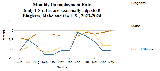 Bingham's monthly unemployment rate was 2.9 percent in May, 2024. This compares to 3.2 percent in Idaho as a whole.