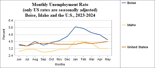 Boise's monthly unemployment rate was 4.2 percent in May, 2024. This compares to 3.2 percent in Idaho as a whole.