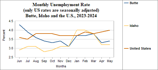Butte's monthly unemployment rate was 3.4 percent in May, 2024. This compares to 3.2 percent in Idaho as a whole.