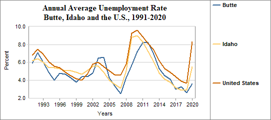 Butte's monthly unemployment rate was 3.5 percent in July, 2025. This compares to 3.8 percent in Idaho as a whole.