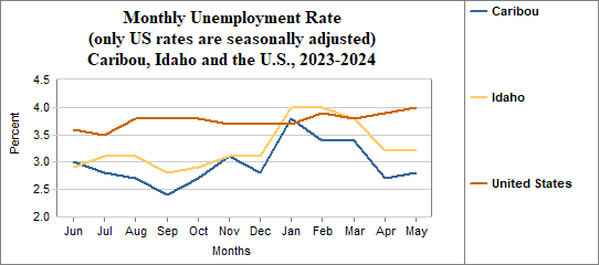 Caribou's monthly unemployment rate was 2.8 percent in May, 2024. This compares to 3.2 percent in Idaho as a whole.