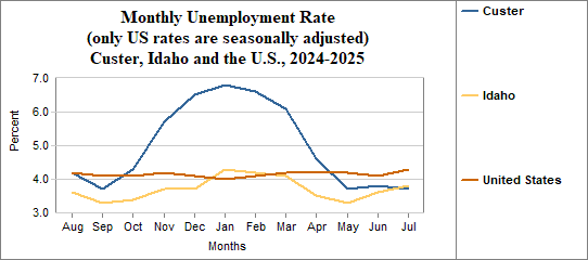 Custer's monthly unemployment rate was 3.7 percent in July, 2025. This compares to 3.8 percent in Idaho as a whole.
