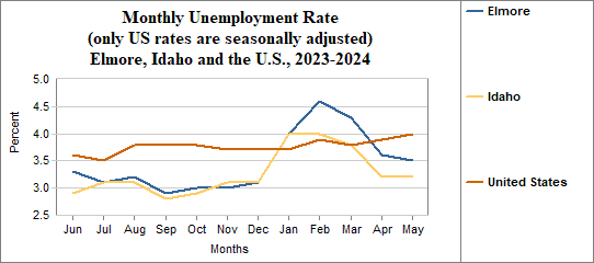 Elmore's monthly unemployment rate was 3.5 percent in May, 2024. This compares to 3.2 percent in Idaho as a whole.