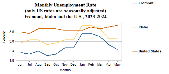 Fremont's monthly unemployment rate was 2.5 percent in May, 2024. This compares to 3.2 percent in Idaho as a whole.
