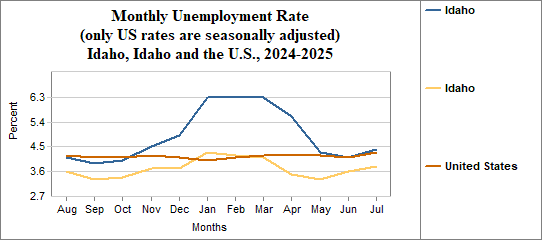 Idaho's monthly unemployment rate was 4.4 percent in July, 2025. This compares to 3.8 percent in Idaho as a whole.