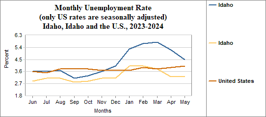 Idaho's monthly unemployment rate was 4.5 percent in May, 2024. This compares to 3.2 percent in Idaho as a whole.