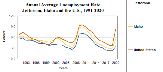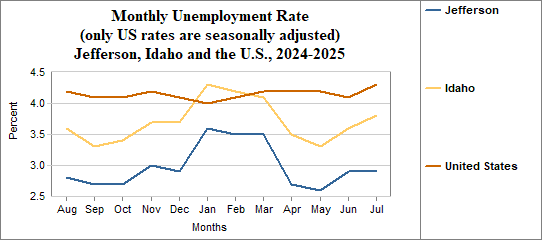 Jefferson's monthly unemployment rate was 2.9 percent in July, 2025. This compares to 3.8 percent in Idaho as a whole.