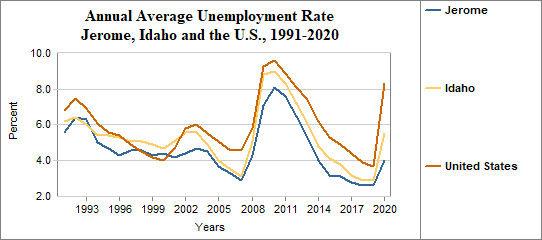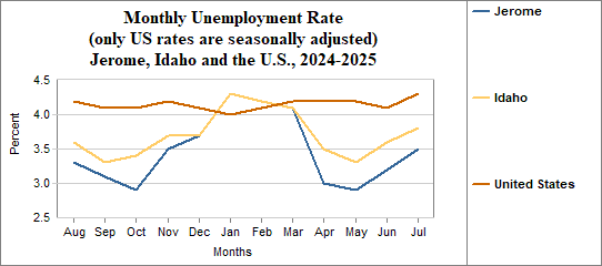 Jerome's monthly unemployment rate was 3.5 percent in July, 2025. This compares to 3.8 percent in Idaho as a whole.