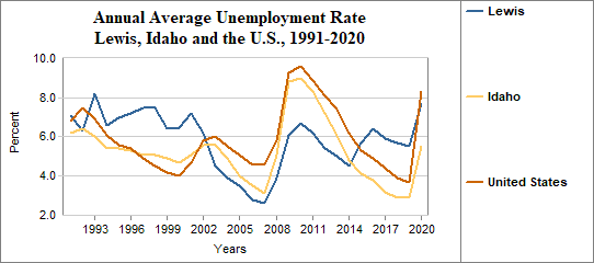 Lewis's monthly unemployment rate was 4.4 percent in July, 2025. This compares to 3.8 percent in Idaho as a whole.