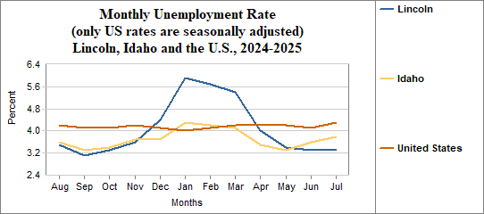 Lincoln's monthly unemployment rate was 3.3 percent in July, 2025. This compares to 3.8 percent in Idaho as a whole.