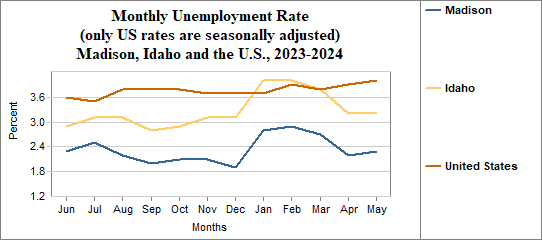 Madison's monthly unemployment rate was 2.3 percent in May, 2024. This compares to 3.2 percent in Idaho as a whole.