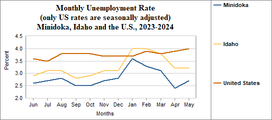 Minidoka's monthly unemployment rate was 2.7 percent in May, 2024. This compares to 3.2 percent in Idaho as a whole.