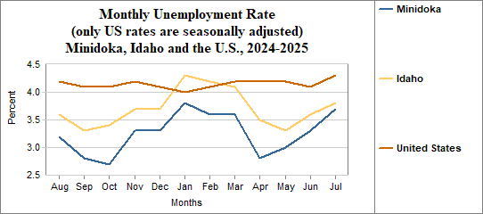 Minidoka's monthly unemployment rate was 3.7 percent in July, 2025. This compares to 3.8 percent in Idaho as a whole.