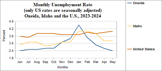Oneida's monthly unemployment rate was 2.4 percent in May, 2024. This compares to 3.2 percent in Idaho as a whole.